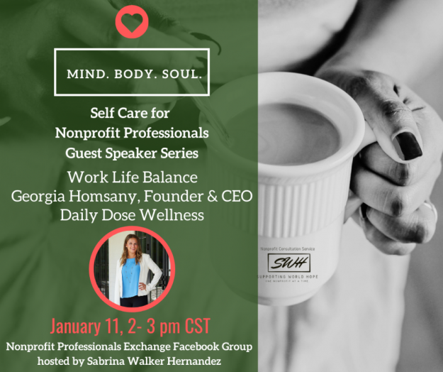 DAILY DOSE’s founder, Georgia Homsany, joined non-profit consultant Sabrina Walker Hernandez to discuss tips for work-life balance for non-profit professionals. This session can apply to anyone and discusses ways to be more mindful in setting goals for the year and putting measures in place to achieve those goals. Self Care Tips Speaking Event January 11,…